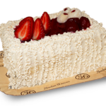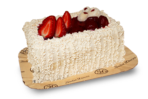 White cake filled with Ninho milk brigadeiro and Ninho milk mousse with red berry jam, topped with white mousse, red berry jam, strawberries, cherries, and mini Ninho milk brigadeiros.